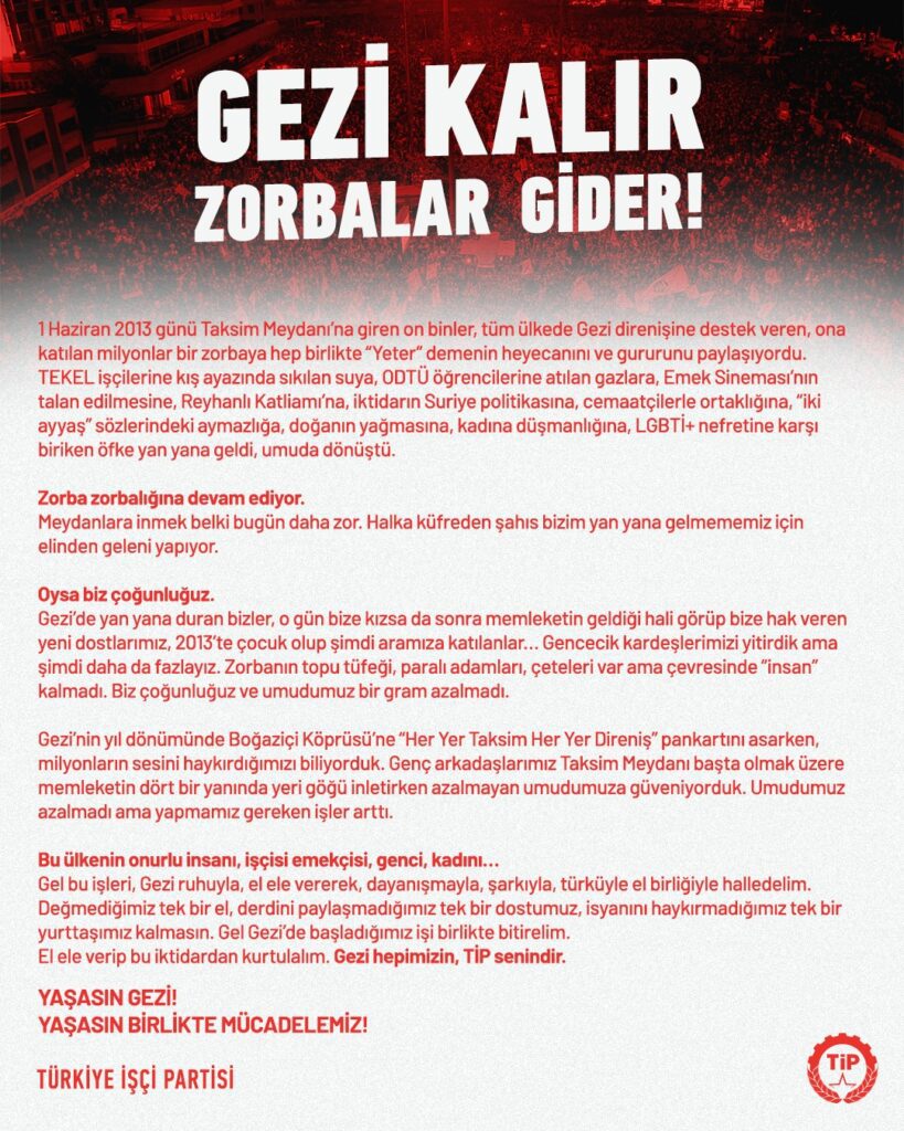 1 Haziran 2013 günü Taksim Meydanı’na giren on binler, tüm ülkede Gezi direnişine destek veren, ona katılan milyonlar bir zorbaya hep birlikte “Yeter” demenin heyecanını ve gururunu paylaşıyordu. TEKEL işçilerine kış ayazında sıkılan suya, ODTÜ öğrencilerine atılan gazlara, Emek Sineması’nın talan edilmesine, Reyhanlı Katliamı’na, iktidarın Suriye politikasına, cemaatçilerle ortaklığına, “iki ayyaş” sözlerindeki aymazlığa, doğanın yağmasına, kadına düşmanlığına, LGBTİ+ nefretine karşı biriken öfke yan yana geldi, umuda dönüştü.